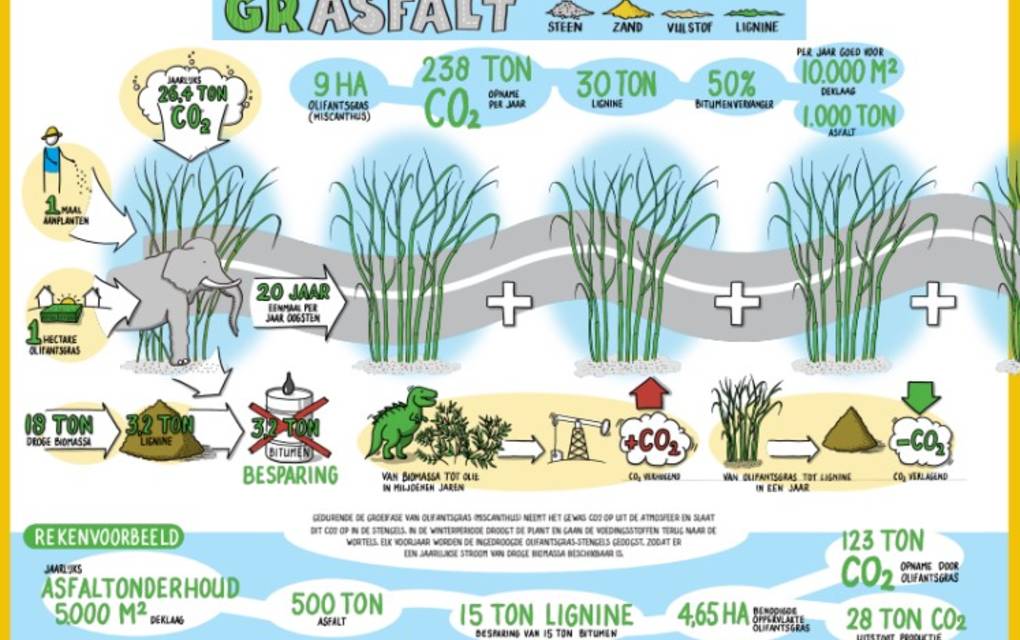 Grasfalt zorgt voor vermindering van fossiele grondstoffen, voor 20% CO2 reductie en voor de duurzame opslag van CO2 door olifantsgras.